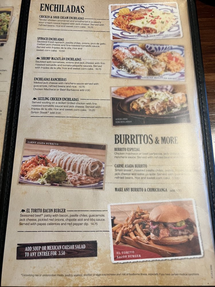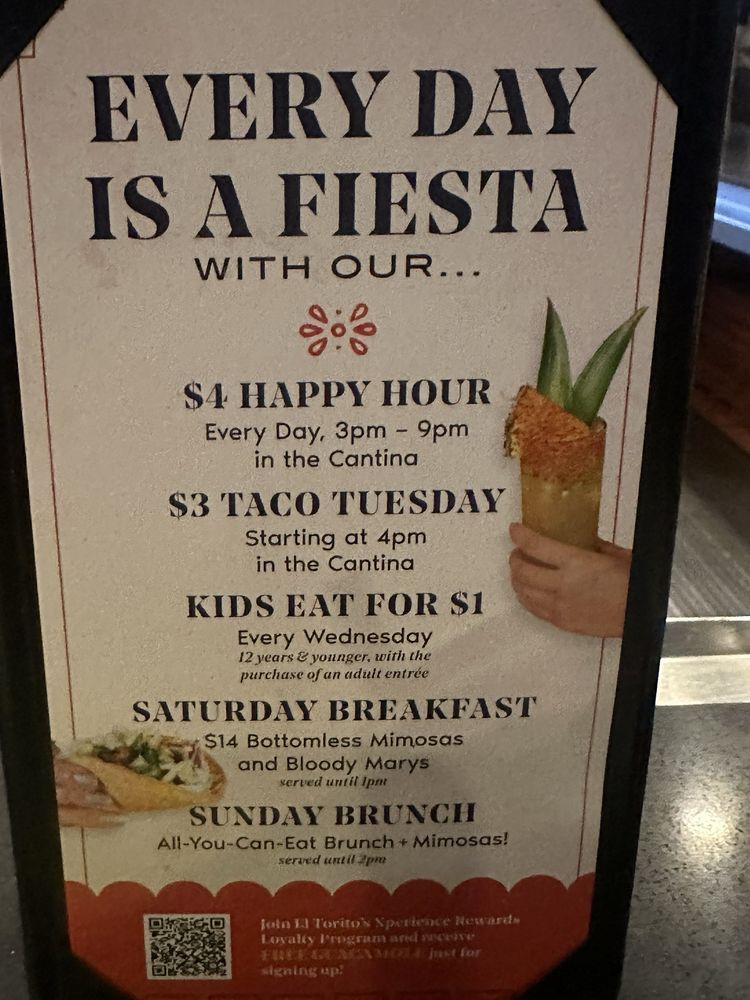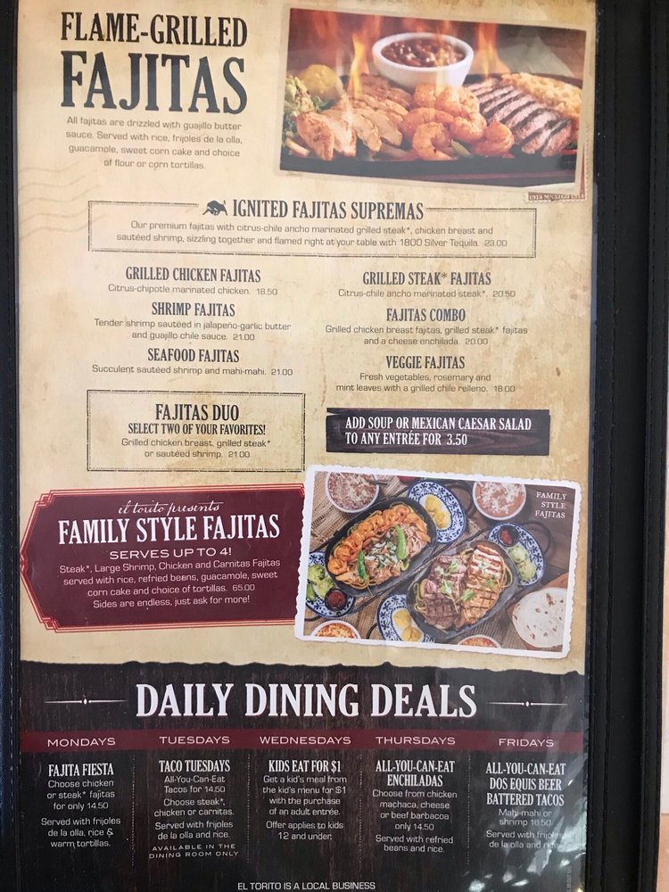 Located at 5242 Lakewood Blvd, El Torito Lakewood serves a vibrant mix of Mexican cuisine that promises to delight your taste buds. The restaurant's menu offers a variety of hearty family feast options, such as the Fiesta Carnitas and Fiesta Tacos, perfect for customizing to your liking. Begin your meal with delicious appetizers like the crispy Quesadilla - Steak or the savory Bacon Wrapped Shrimp.