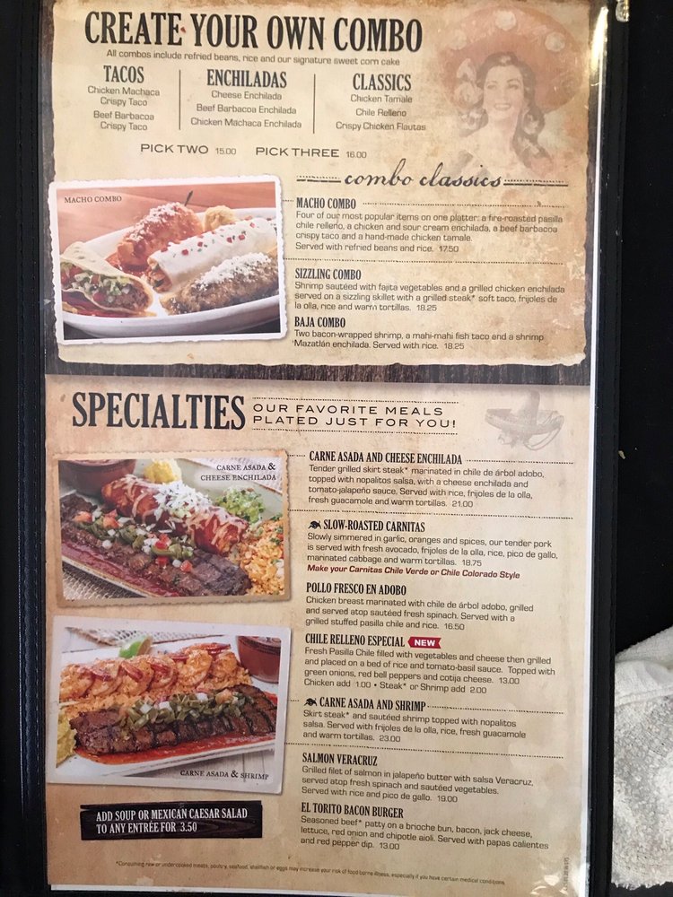 Shrimp sauted with fajita vegetables and a grilled chicken enchilada with a grilled steak soft taco, frijoles de la olla, rice and warm tortillas.